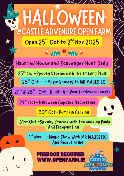 Get ready for a wickedly good time at Castle Adventure Open Farm's Halloween Midterm Event! We're packed with spooky fun for the whole family, running daily from October 25th to November 2nd.